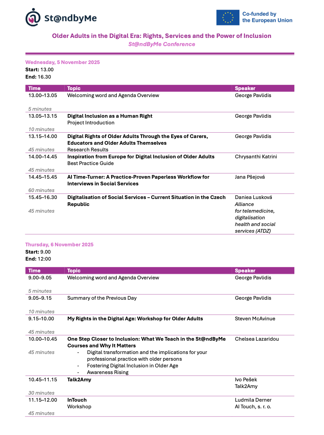 a two-day gathering dedicated to practical, people-first digital inclusion, held in Tábor,(Czech Republic) at the Hotel Palcát. On Wednesday, 5 November 2025 (13:00–16:30) and Thursday, 6 November 2025 (09:00–12:00), experts and practitioners will share research, best practices, and hands-on tools that empower older adults and the professionals who support them. Sessions span digital rights, a paperless workflow for social-service interviews, the state of social-service digitalisation, and interactive workshops on everyday digital skills and inclusive teaching. Whether you are a caregiver, educator, policymaker, or an older adult yourself, come learn, connect, and take home actionable ideas to make the digital world work for everyone.